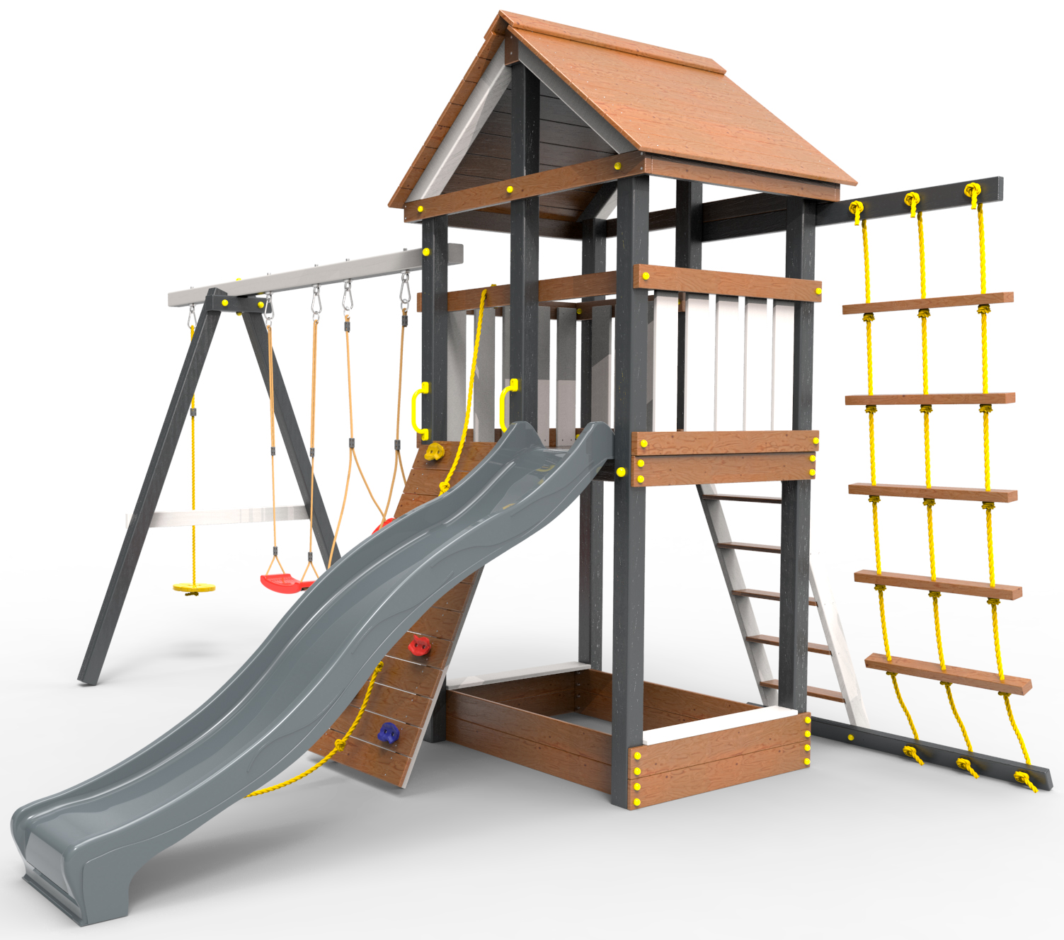 Обращаем Ваше внимание, что фактический цвет детской площадки может отличаться от представленных фото на сайте. Специфика окраски нетоксичными пропитками и красителями допускает отклонения в цветовой гамме отгружаемых изделий. Также обратите внимание, что фактический цвет может отличаться из-за цветопередачи устройства на котором Вы смотрите фото.